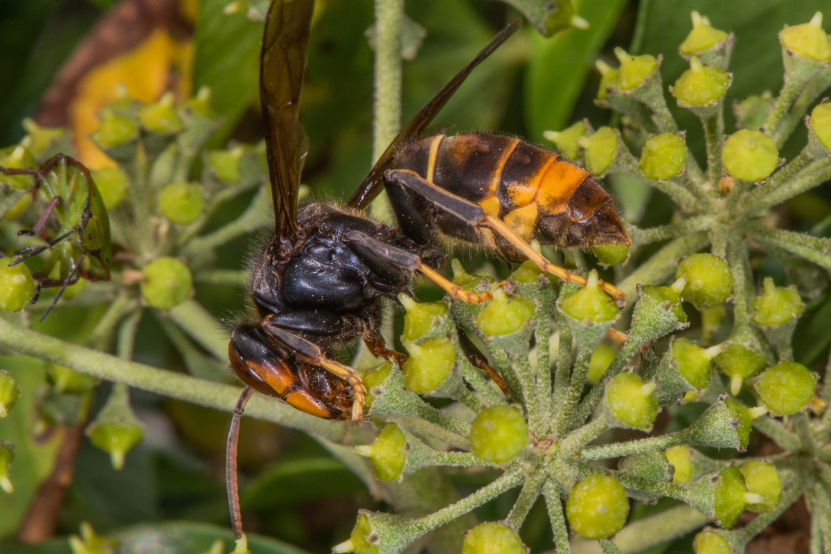 Die Asiatische Hornisse ist kleiner als unsere einheimische Hornisse, aber für Honigbienen ein Albtraum. Im Sommer und Herbst lauert sie am Flugloch, schnappt Bienen aus der Luft und schwächt so ganze Völker.